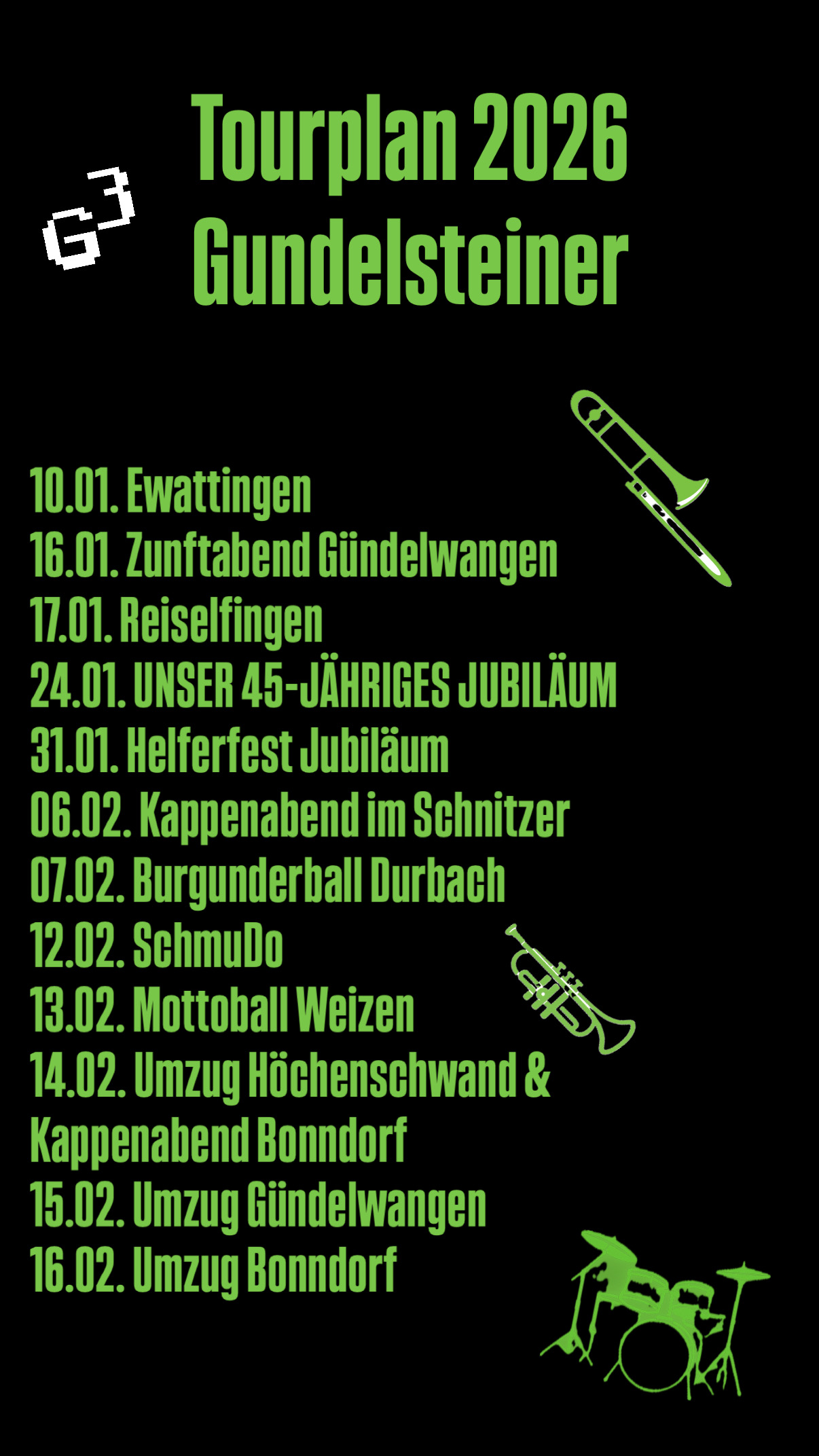 Aktuelle Termine der Gundelsteiner Guggenmusik Gündelwangen e.V.. Bleibe up to date und folge unseren Terminen, Veranstaltungen, Events und Proben.
